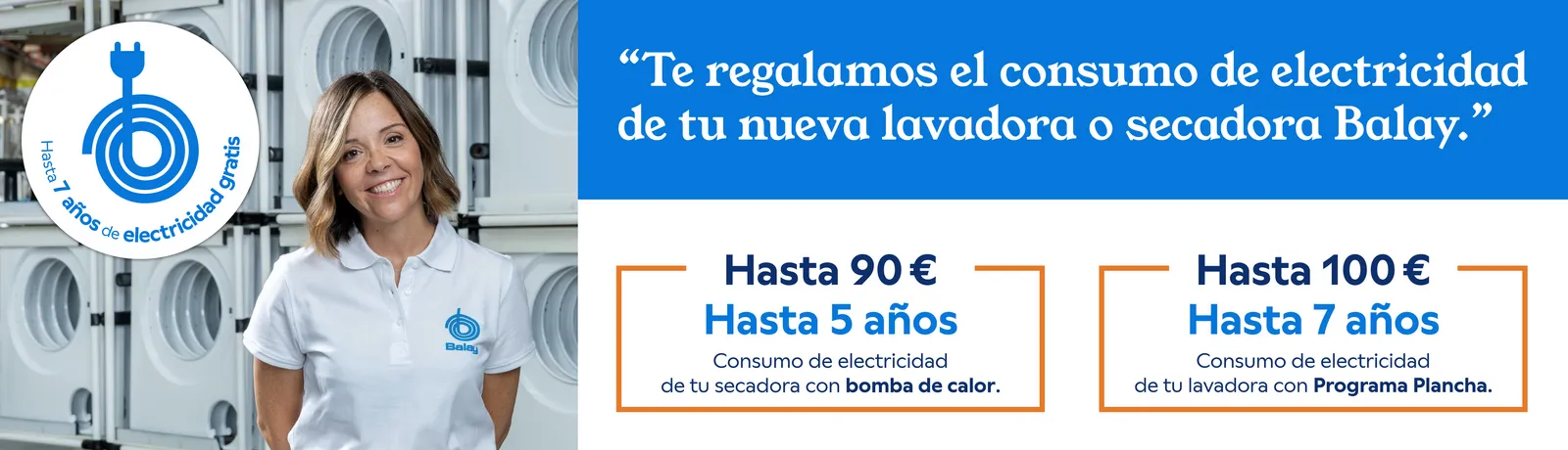 Porque un amigo sabe cómo agradecer tu confianza, en Balay queremos regalarte hasta 7 años del consumo de electricidad de tu nueva lavadora*, lo equivalente hasta 100€ o hasta 5 años del consumo de electricidad de tu nueva secadora* Balay, lo equivalente hasta 90€.