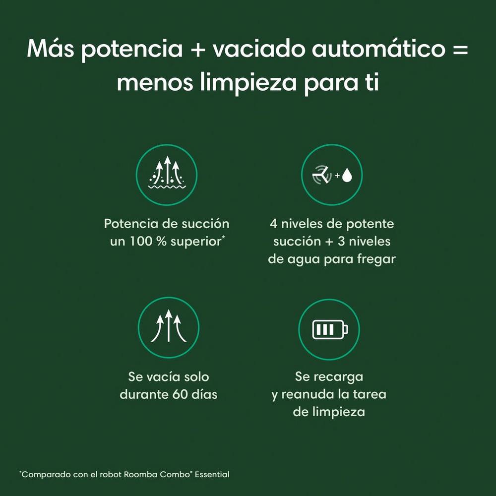 El robot Roomba Combo® 2 Essential con la base AutoEmpty™ facilita la limpieza, con una tecnología de navegación que lo guía para aspirar y fregar los suelos en filas ordenadas. Lo mejor de todo es que se vacía por sí solo en una bolsa que puede contener hasta 60 días de suciedad y residuos, permitiéndote más tiempo para hacer lo que realmente te gusta.