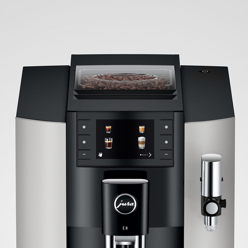 La última generación de la E8 satisface en todos los sentidos las elevadas exigencias requeridas para el desarrollo del modelo de máquina automática más exitoso de JURA. Este modelo sorprende con sus excelentes resultados de café, destaca por su manejo aún más sencillo y sienta un precedente gracias a su diseño moderno y esbelto.