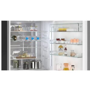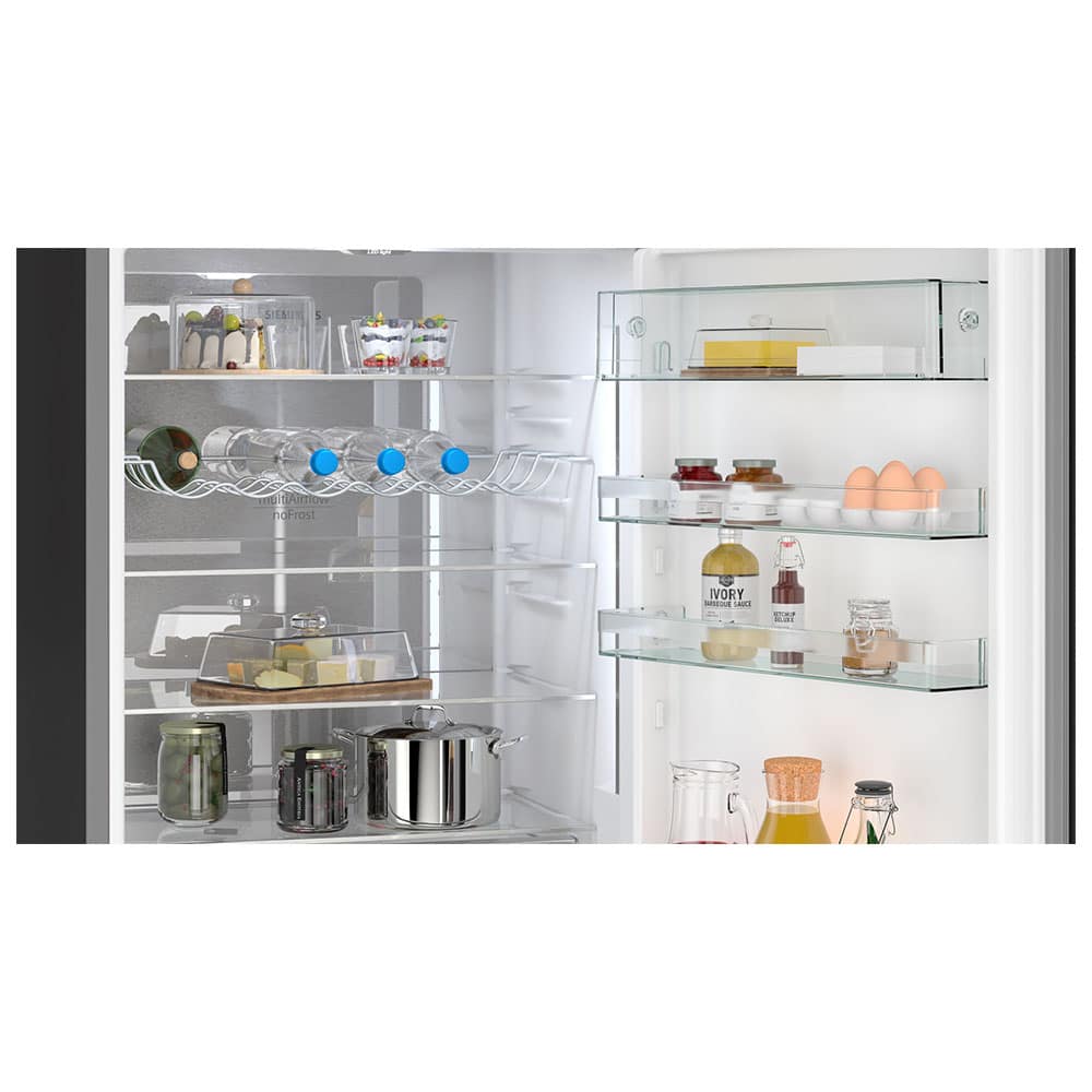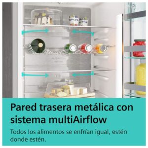 ¿Quieres asegurarte de que todas las partes de tu frigorífico enfrían igual? La pared trasera metálica con el sistema multiAirflow hace que el aire circule de manera uniforme dentro del frigorífico para que la temperatura sea constante en todos los niveles. Así, cuando metes alimentos en cualquier parte de la nevera, se enfrían rápidamente y se conservan frescos durante más tiempo.