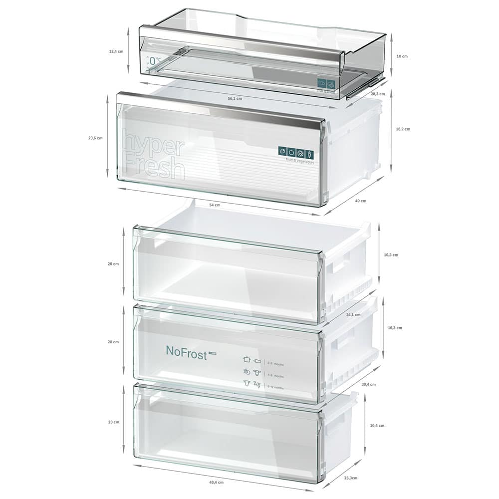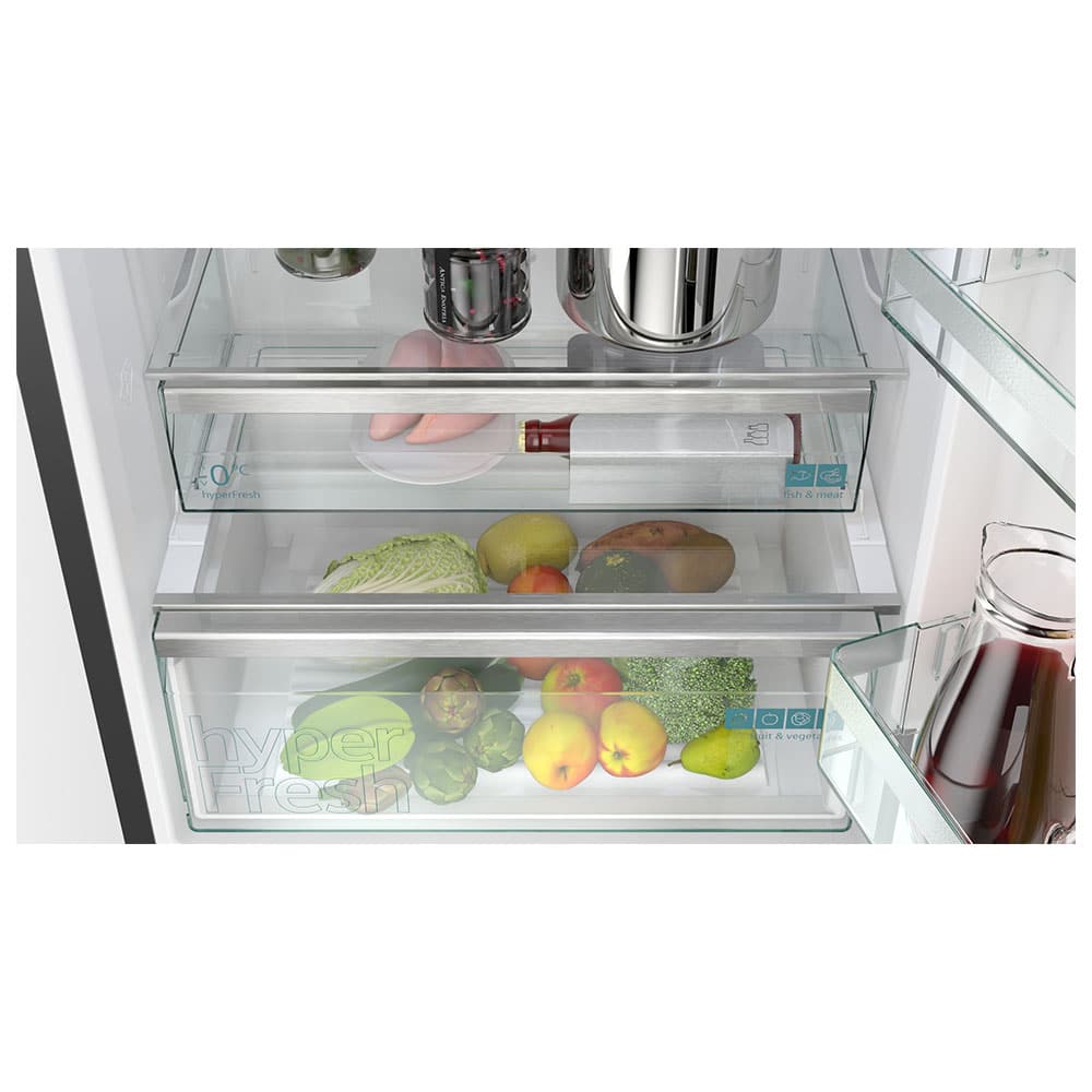 Obtén el espacio que necesitas para guardar grandes cantidades de frutas y verduras.Además, hay un compartimento especial para la carne y el pescado que tiene su propio suministro de aire frío, de modo que aguantan en perfectas condiciones durante más tiempo.Más espacio y mejor organización en tu frigorífico.