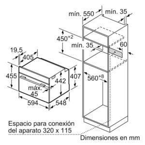 | Dimensiones y peso | Dimensiones de instalación necesarias (H x W x D): 455 x 594 x 548 mm, Altura mínima del hueco: 450 mm, Altura máxima para la instalación: 455 mm, Anchura mínima del hueco: 560 mm, Anchura máxima del hueco: 568 mm, Fondo del hueco: 550 mm, Peso neto: 34,9 kg |